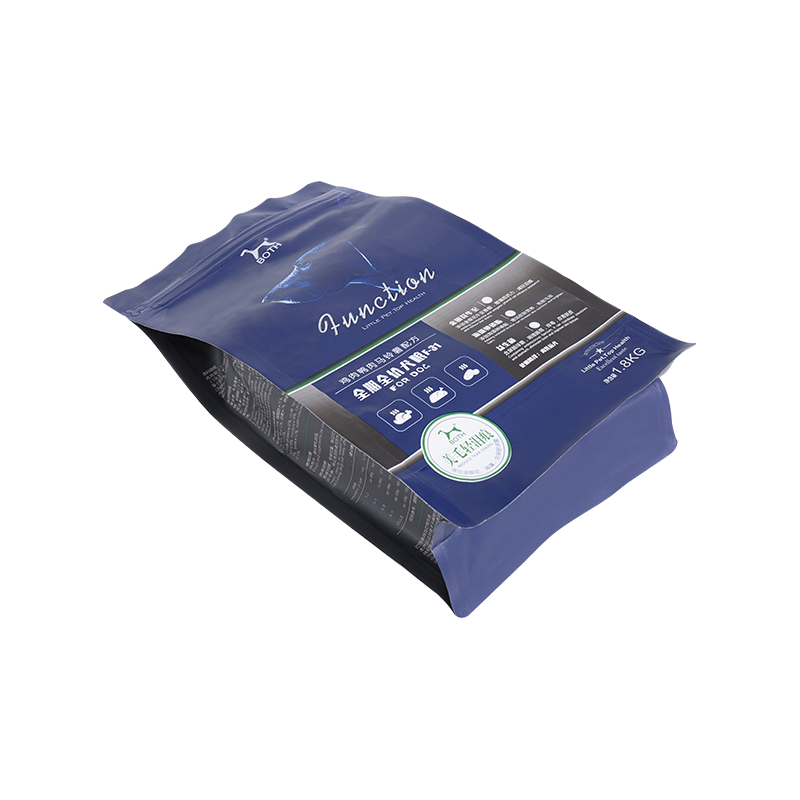 Ang walong-side seal na bag ng pagkain ng aso ay nagpatibay ng isang three-dimensional na walong panig na istraktura ng sealing, na may isang parisukat na hugis at malinaw na mga gilid at sulok, na nagpapabuti sa paglaban ng compression at katatagan ng pag-stack. Gumagamit ito ng mga materyal na composite na may mataas na lakas (tulad ng PET/AL/PE) upang maiwasan ang kahalumigmigan, oxygen, at ilaw, epektibong pag-lock sa pagiging bago. Ang tuktok ay dinisenyo gamit ang isang madaling-tinedis o zipper seal para sa madaling pagbubukas at pagsasara at paulit-ulit na pagbubuklod. Ang mga ribs ng pampalakas sa gilid ay nagpapaganda ng kapasidad ng pag-load, at ang malawak na ilalim ay matatag na nakatayo. Ang ibabaw ay maaaring mai-print na may kulay na may mataas na katumpakan, at ang isang transparent window ay maaaring magamit upang ipakita ang mga nilalaman. Ito ay angkop para sa malaking kapasidad na packaging ng 5-20kg, pinagsasama ang tibay at kaginhawaan upang matugunan ang pangmatagalang pangangailangan ng pangangalaga ng pagkain ng alagang hayop.